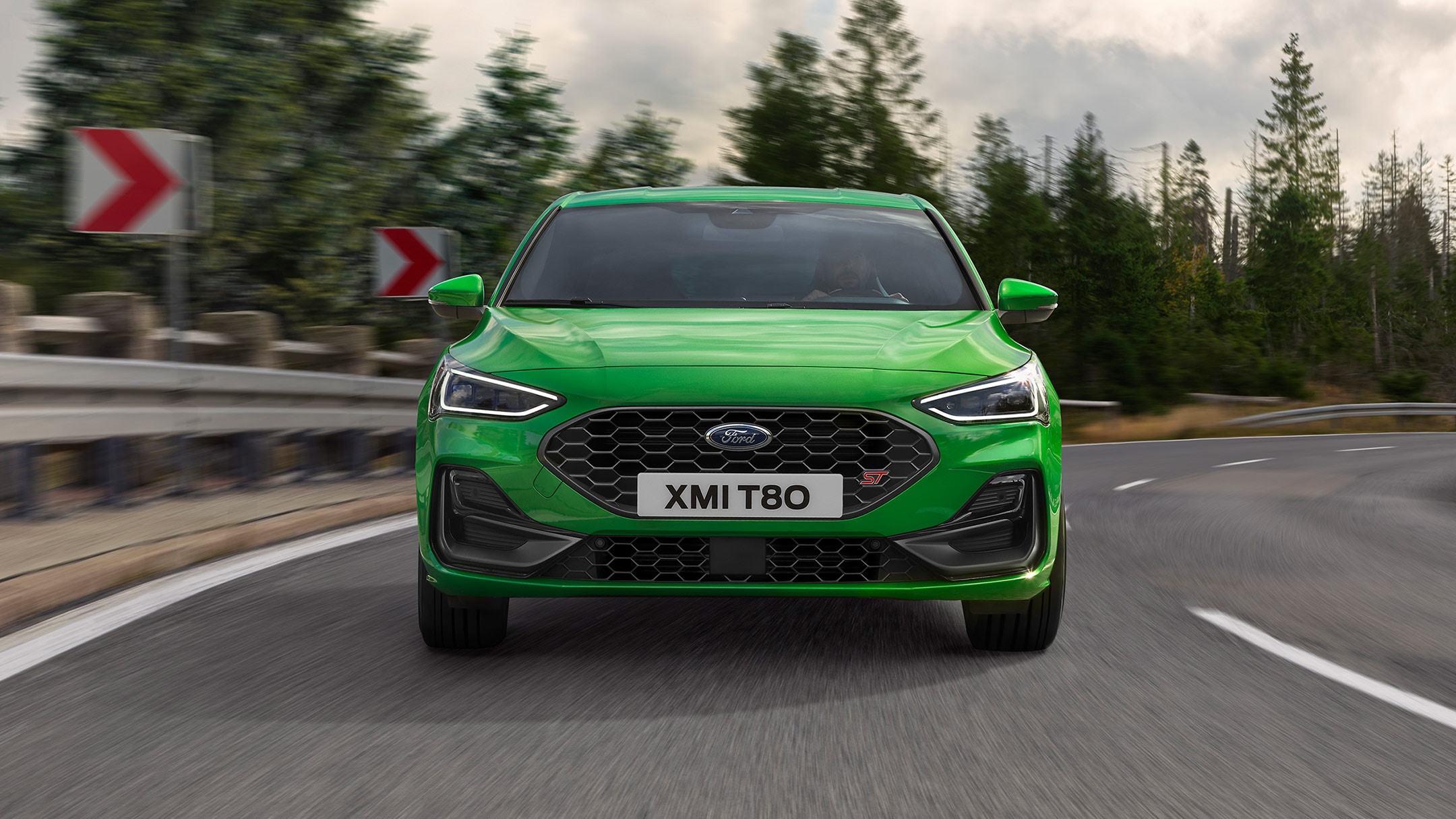 Ford Focus ST in Grün. Dreiviertelansicht, fahrend auf einer Straße. Bäume im Hintergrund.